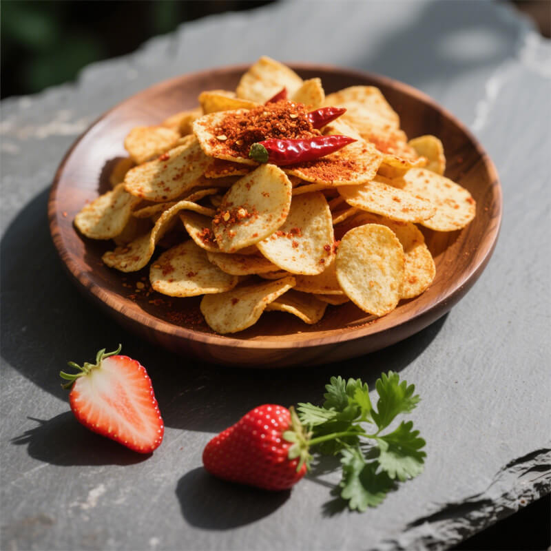 脱油步骤需在竹筛中颠晃 30 秒,让多余油脂滴落;调味则是画龙点睛,陆良本地的 “辣参” 辣椒面与会泽花椒按 3:1 配比,加入微量盐与白砂糖,经滚筒搅拌后均匀附着在薯片表面。然后经质检(剔除焦片、碎渣)、包装(传统油纸包裹或真空封装),一套工序耗时整整 16 小时。